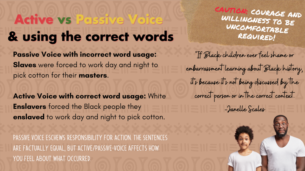 The passive example here uses the noun “slave” instead of describing a person as “enslaved” by another. Using the word “slave” can imply a description of a person’s core existence; they are not a person, they are a slave. The active version of this sentence assigns responsibility to the enslaver and acknowledges the humanity of enslaved Black people; they are people first and foremost.