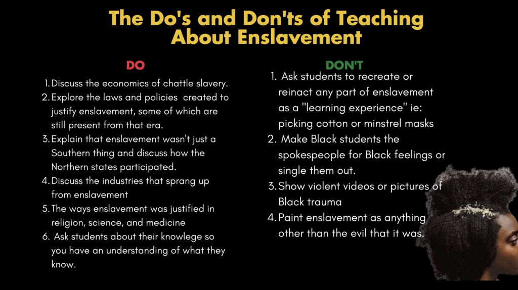 Here, Yolanda shares some essential dos and don’ts for teaching about enslavement. Most of these points apply to the enslavement of Black people globally, but a few are specific to the U.S. (here, Northern and Southern states refer to the United States regions that would eventually form two opposing factions in the American Civil War).