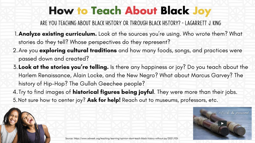 “We want to highlight the joy, innovation, and resilience of Black people and culture by shifting the way we teach Black history. Most schools discuss Black history through the lens of enslavement and the Civil Rights Movement, and these topics may create feelings of discomfort and shame among Black students. Many lessons feed into a narrative of inferiority, all during a month that’s supposed to celebrate and uplift Black people.”