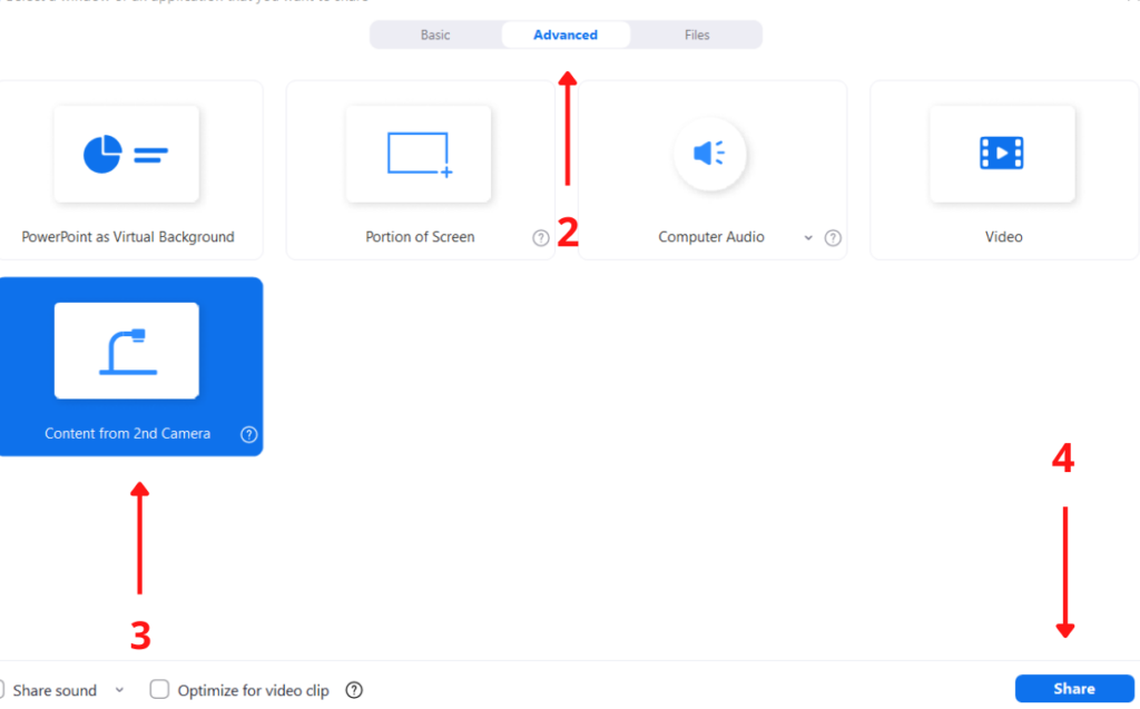 A simple approach is to continue to use your computer camera to show your face as you teach the class. To also have your second camera’s images on the screen (the one showing your project in action), you can follow these simple steps to screen share what your additional camera is capturing.