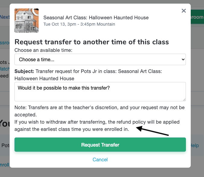 Going forward, we’ll apply the timing of the refund policy (e.g. seven days until class starts, first week of class) against the start time of the earliest section the parent transferred from/into, as opposed to the final section they were transferred into. We’ve added a new note to the transfer request screen and to our help center article about refunds.
