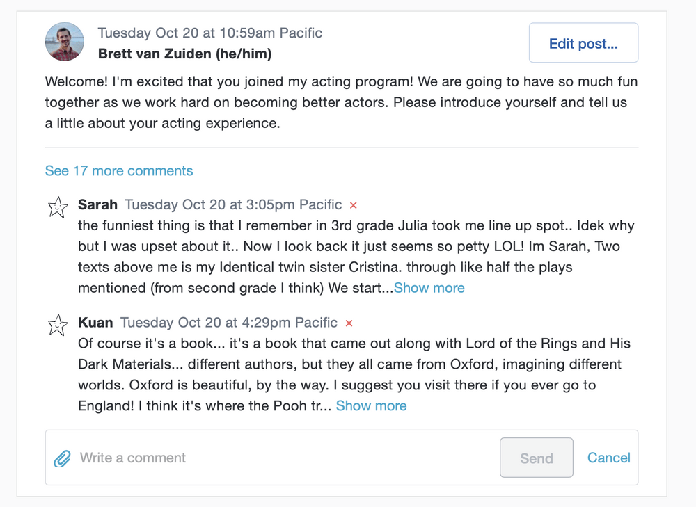 We’re making the Outschool classroom easier to use for those highly engaged classes with lots and lots of activity. Now, long comments and comment threads will start collapsed, making it a bit easier to navigate your classroom even if your learners like to write essays back and forth to one another!